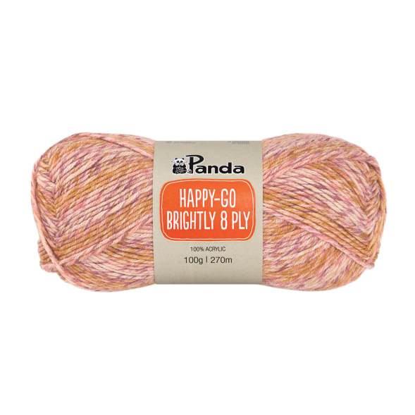 Panda Happy-go Brightly  is a fun, super-soft 8 ply perfect for kids or babies knits. Easy care acrylic with a kaleidoscopic mix of colours in every ball.