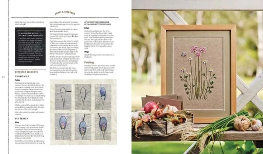 • Chives & Chamomile Pretty flowering chives paired with chamomile and a visiting butterfly, enhanced with delicate touches of stumpwork.