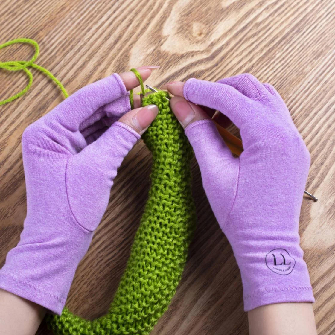 Made from soft, breathable fabric, they offer light compression to ease tension and keep your hands feeling happy while you knit, crochet, stitch, or create to your heart’s content. The open‑finger design means you still get full control and feel of your yarn — because we all know the magic is in the fingertips.