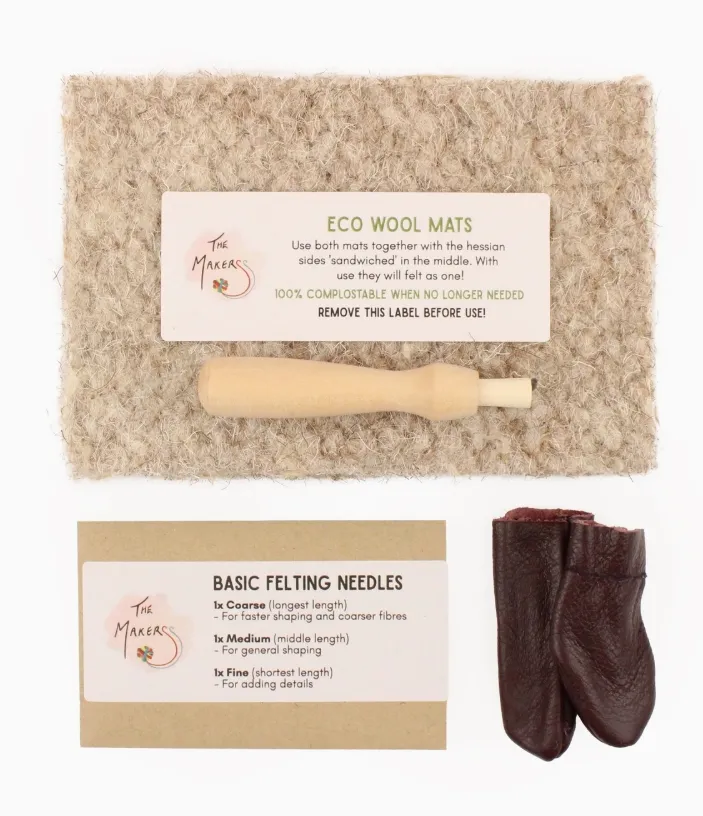 Our eco tool kit is great for a beginner, this sustainable tool kit includes three needles (1x fine #40, 1x medium #38 and 1x coarse #36) and the two EcoWool mats measure 10cm x 15cm (A6 - postcard size), leather finger protectors and a wooden needle handle with an extra felting needle (medium #38) This kit includes tools to make the process of needle felting more comfortable if you prefer a handle which holds the needle rather than holding it directly in your hand. It also includes two leather finger protectors (usually worn on the thumb and index finger and one of the protectors is shorter and wider whilst the other is shorter and narrower).