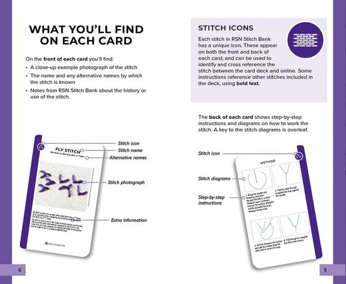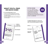 • 50 colourful cards, each of which showcases an individual embroidery stitch. The 50 stitches have been carefully selected to provide a broad and varied collection. On the front of each 140 x 85mm card is a colour photograph of the finished stitch, accompanied by any alternative names and its historical usage. When you're ready to start stitching, simply flip the card over to reveal clear illustrations and step-by-step written instructions.